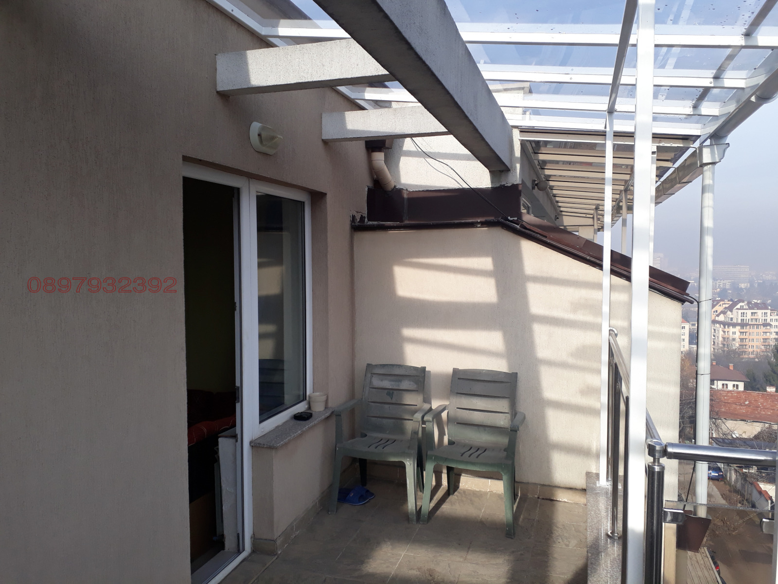 Давам под наем маломерен двустаен напълно обзаведен апартамент в долната част на Бояна. Имотът е след освежителен ремонт, светъл и топъл, находящ се на пети последен етаж (нормален, без скосявания). Сградата е ново строителство от 2010г., с индивидуално газово котле за всеки апартамент, 5 камерна немска дограма Саламандър, луксозно изпълнени общи части, асансьор и сервизни помещения; намира се в затворен комплекс с контролиран достъп, с вътрешен двор с градина и детска площадка. Разполага и с климатик. Апартаментът се състои от антре, баня с тоалетна, кухня с всекидневна, от които има преход към спалнята. Терасата е просторна, с уникална панорамна гледка към София и част от Витоша. Изложение - изток. На пешеходно разстояние от комплекса има детска градина, училище, голям супермаркет Фантастико, аптеки; на 7-8 минути пеша има спирки на трамваи 4, 5 и 11 (на 2 спирки от метростанция) и на автобуси 107, 260 и 111 - много бърз достъп до бул. Цар Борис III и до Околовръстен път. Частно лице, без брокери.