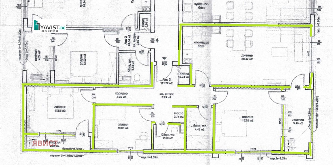 Многостаен апартамент с площ от 141кв.м. разпределени в дневна с кухненски кът, три спални, коридор, баня-тоалетна. още една баня-тоалетна, килер, и две тераси