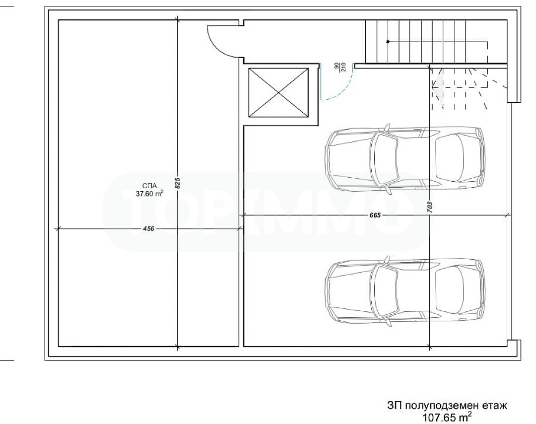 Полуподземен етаж -застроена площ 107.65 кв.м. - двоен гараж, помещение 37.6 кв.м. подходящо за СПА зона, фитнес, кино салон и др., асансьор към втори и трети етаж;
