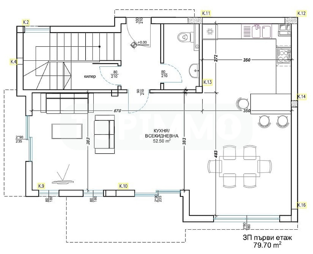 Първи етаж - застроена площ 107.65 кв.м. - антре с килер и стълбище към втори етаж, просторна дневна с кухненски бокс и трапезария 68.7 кв.м с излаз на веранда, санитарен възел;