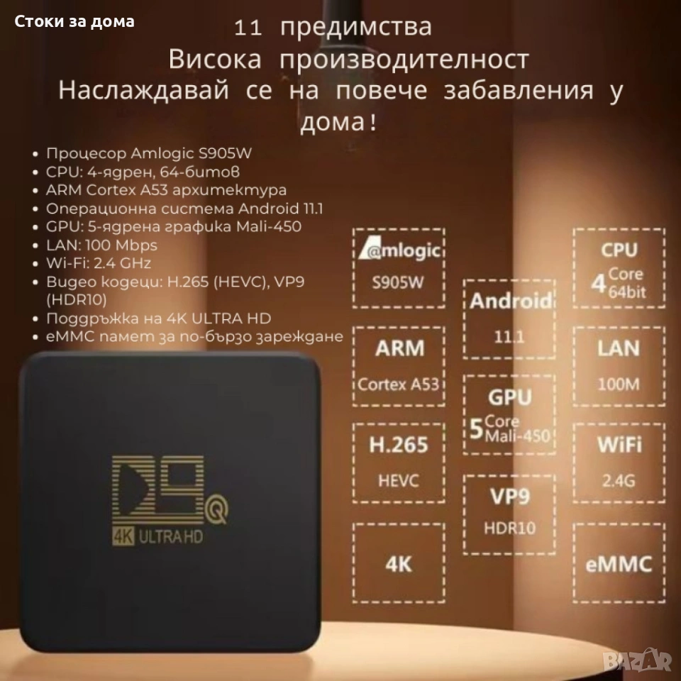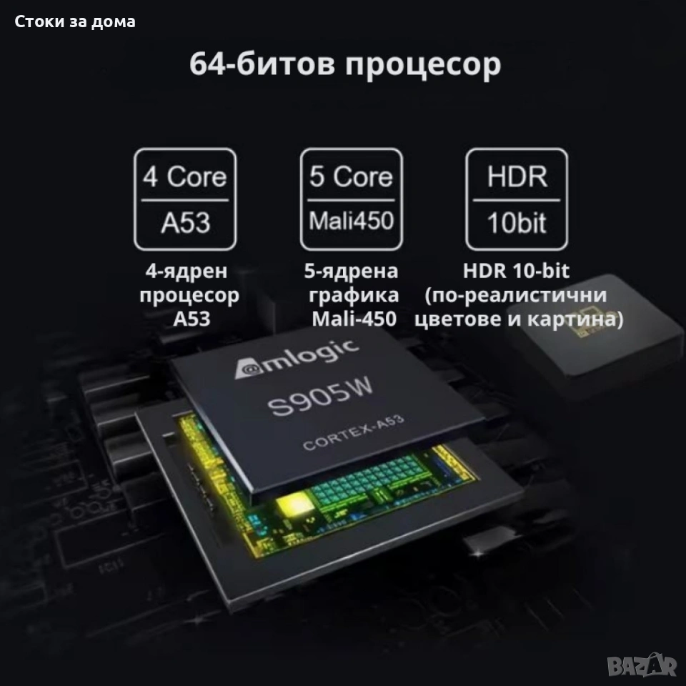 Процесор: Amlogic S905W, Quad-Core, ARM Cortex-A53, 64-bit