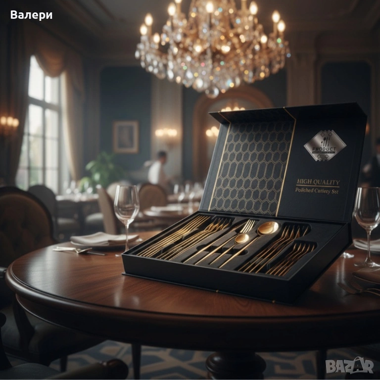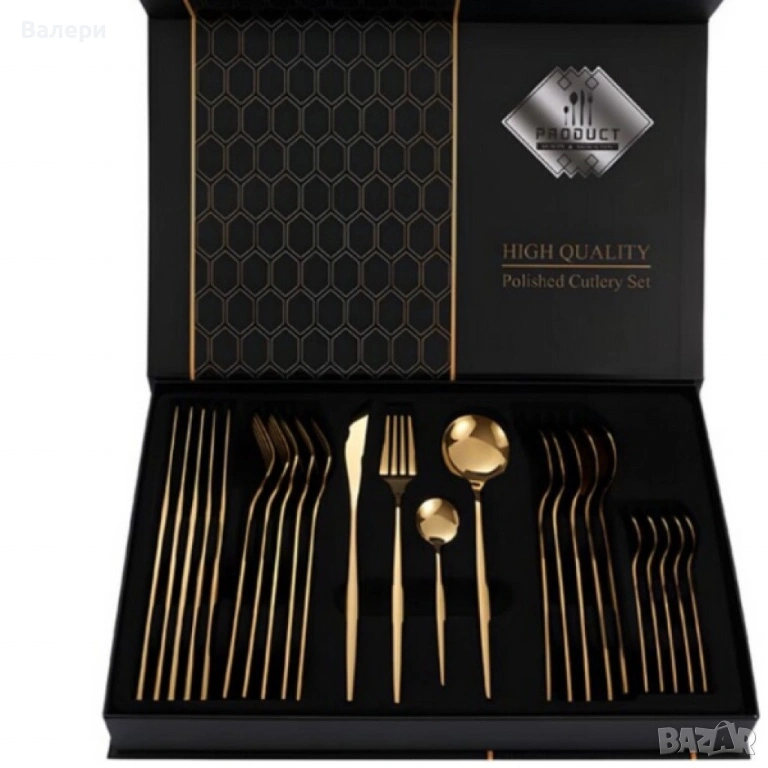 Комплект прибори за хранене в златист цвят от 24 части с луксозен дизайн и магнитна кутия → Обява 53201232