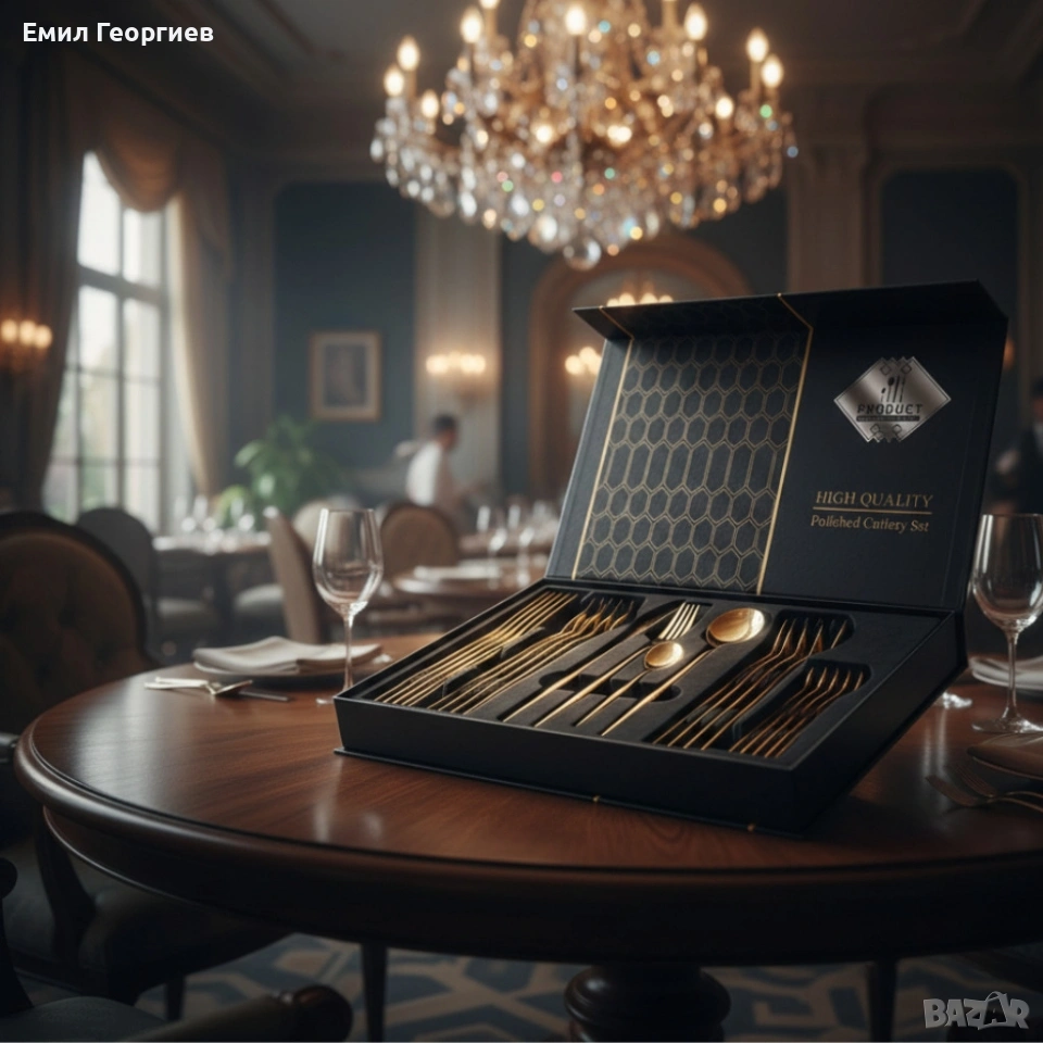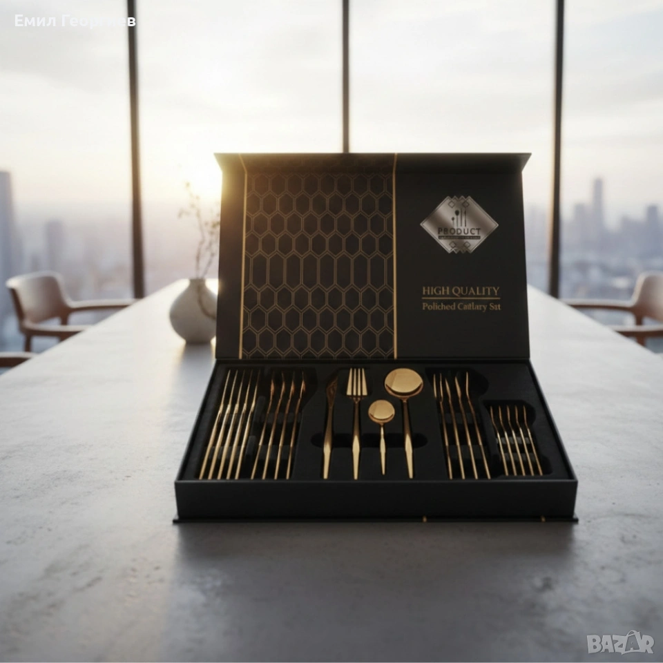 Комплект прибори за хранене в златист цвят от 24 части с луксозен дизайн и магнитна кутия → Обява 53202010