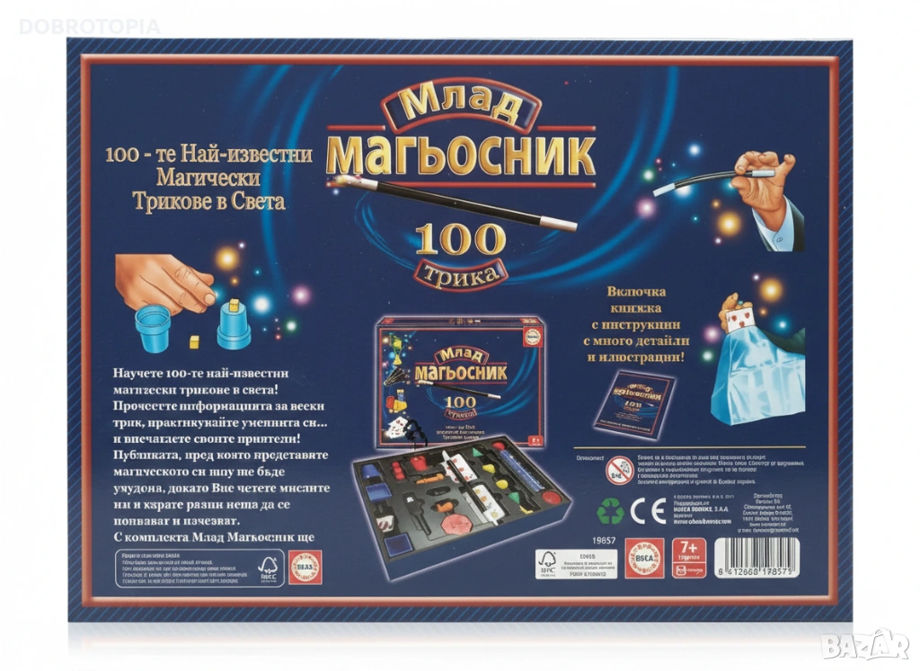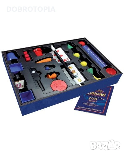 Кутията съдържа всички необходими реквизити за овладяването на 100 невероятни фокуса и организирането на цялостно магическо шоу.