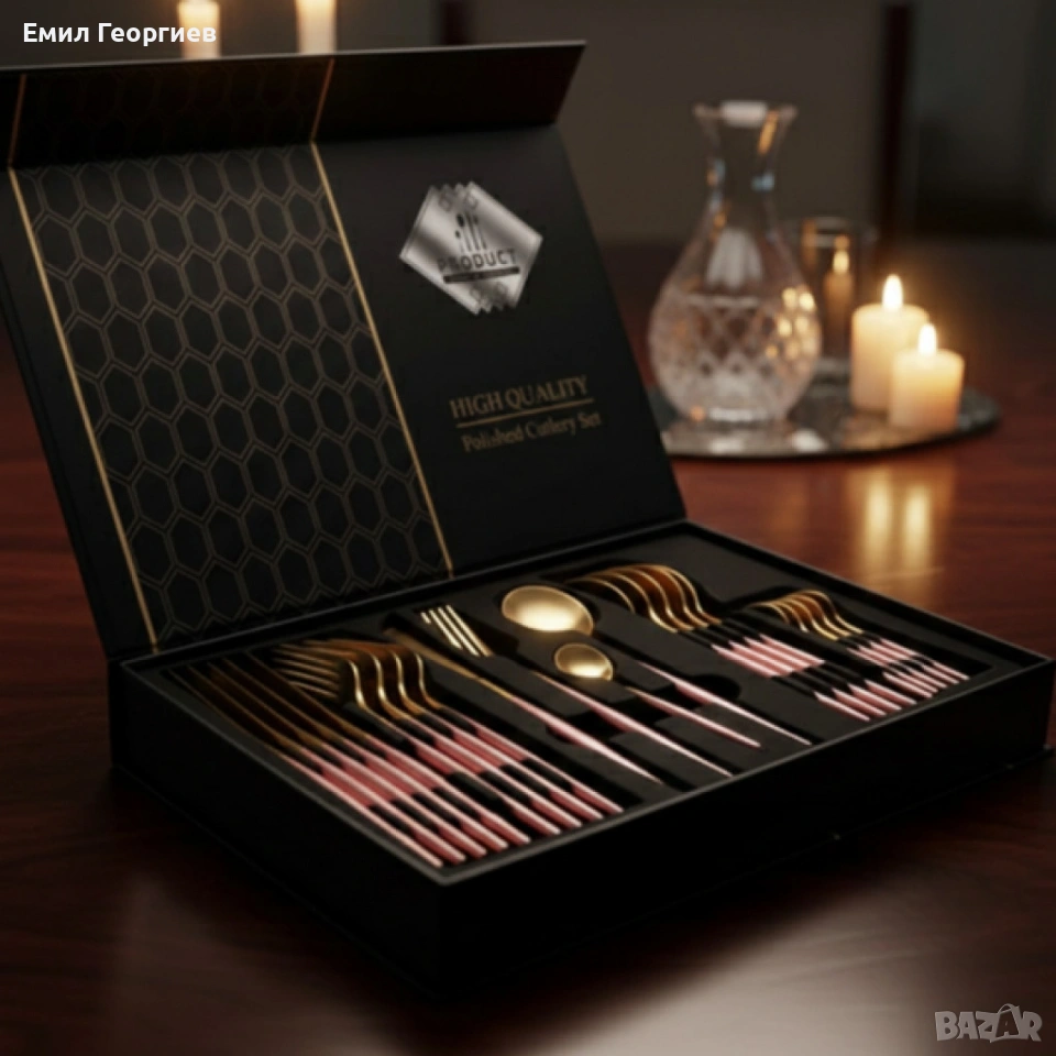 Комплект прибори за хранене от 24 части с луксозен дизайн и магнитна кутия в златисто и розово → Обява 53202186