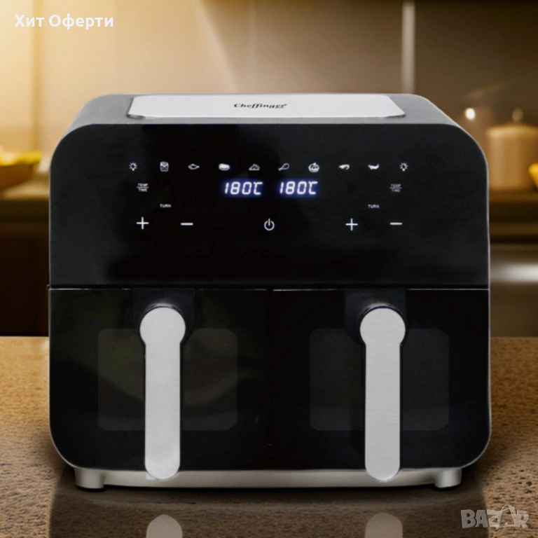 Двоен фритюрник с горещ въздух Cheffinger 9 л с дигитален дисплей, стъклен прозорец и 360° циркулац → Обява 53202527