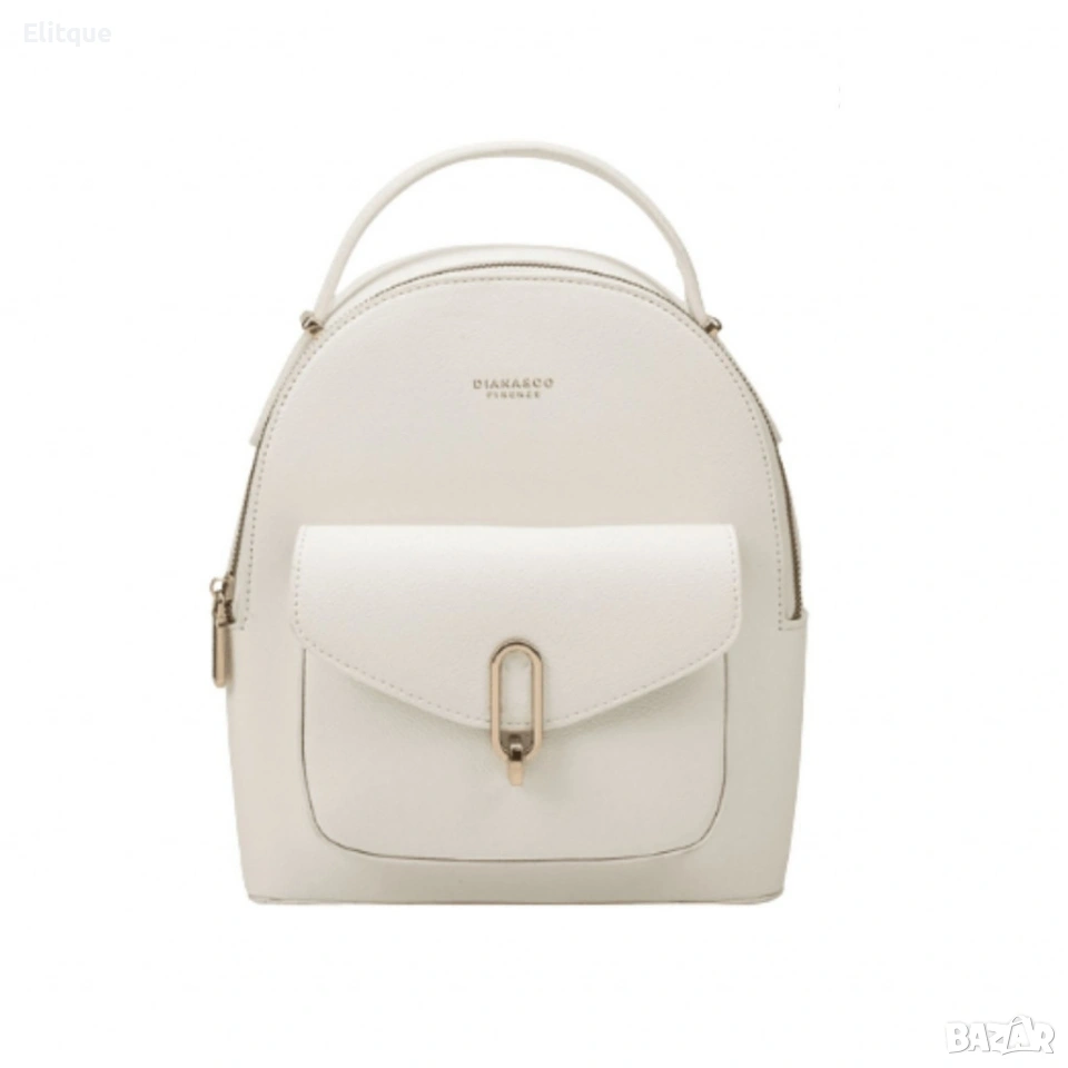 Тип продукт: Дамска раница; Diana & Co предлага елегантна дамска раница с изчистен и модерен дизайн, която съчетава функционалност и стил. Подходяща както за ежедневието, така и за пътувания, тя придава завършеност на всяка визия – от градски шик до по-непринудена спортно-елегантна комбинация. – Материал: висококачествена еко кожа (PU); – Размери: приблизително 26 см (височина) x 22 см (ширина) x 12 см (дълбочина); – Джобове: 1 основно отделение с цип, 1 външен джоб с капак, вътрешни отделения за организация; – Подплата: текстилна с фин десен; – Затваряне: цип и капак с декоративна метална катарама; – Регулируеми презрамки; - Цвят: Бял , черен; – Метални крачета в долната част за защита при поставяне.