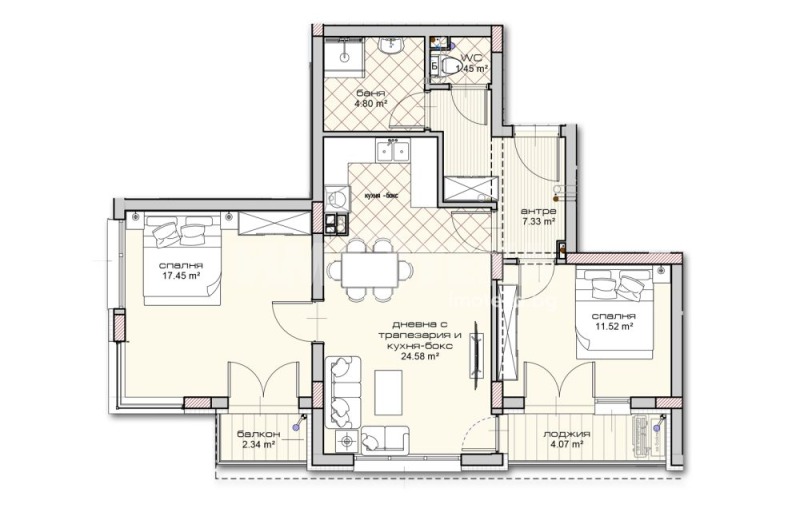 Параметрите от всяка една стая са впечетляващи - дневна около 25 кв.м. , родителска спалня около 18 кв.м. и втора спалня около 12 кв.м. Апартаментът разполага с две мокри помещения - баня с тоалетна около 5 кв.м. и самостоятелна тоалетна. Коридорът е фунционален с място за гаредроб, портманто и други мебели за съхранение.