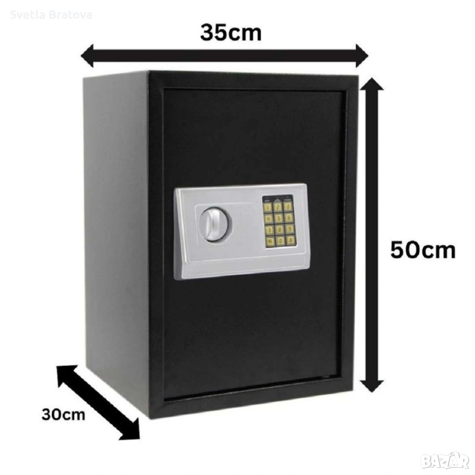 Материал / корпус: Стомана с дебелина 1,4 мм; врата с дебелина 3 мм; Размери / тегло: 50 x 35 x 50 см, тегло: 12,15 кг; Мощност / батерия: 4 x AA батерии, включени в комплекта; Съхранение / капацитет: 43 литра; Допълнителни функции: Премахваем рафт, ключ за аварийно отваряне, монтажни болтове включени; Сертификации / безопасност: Сертифициран за съхранение на ценни предмети и документи в домашни условия.