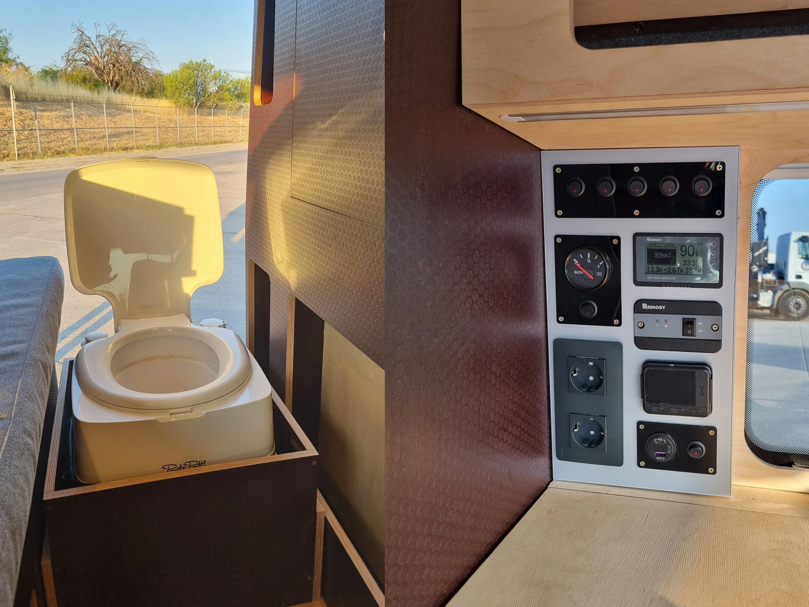 хладилник 12V- 42 литра дизелов отоплител VEVOR 5 KW люк с вентилатор ------------ Контролер Renogy DC-DC Battery charger with MPPT Инвертор Renogy 2000W 12V Pure Sine Wave Втори литиев акумулатор Renogy 100А Соларен панел 200W Външна връзка за 220V ----------- USB зареждачки за телефон- 3 бр. Контакти за 220V - 4 бр. LED осветление ----------- вътрешна изолация на стени и под мебели изработени от брезов шперплат и шперплат сито HEXA маса с ексцентрик крак винилна настилка на пода ----------- багажник на покрива с опция за добавяне на още един солар или куфар за багаж