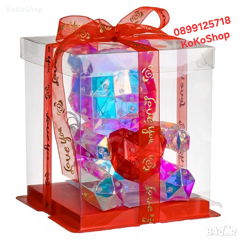светещо мече със сърце, с LED светлини, поставено в луксозна прозрачна кутия с красива панделка. Продуктът впечатлява още от първия поглед и създава силна романтична емоция.