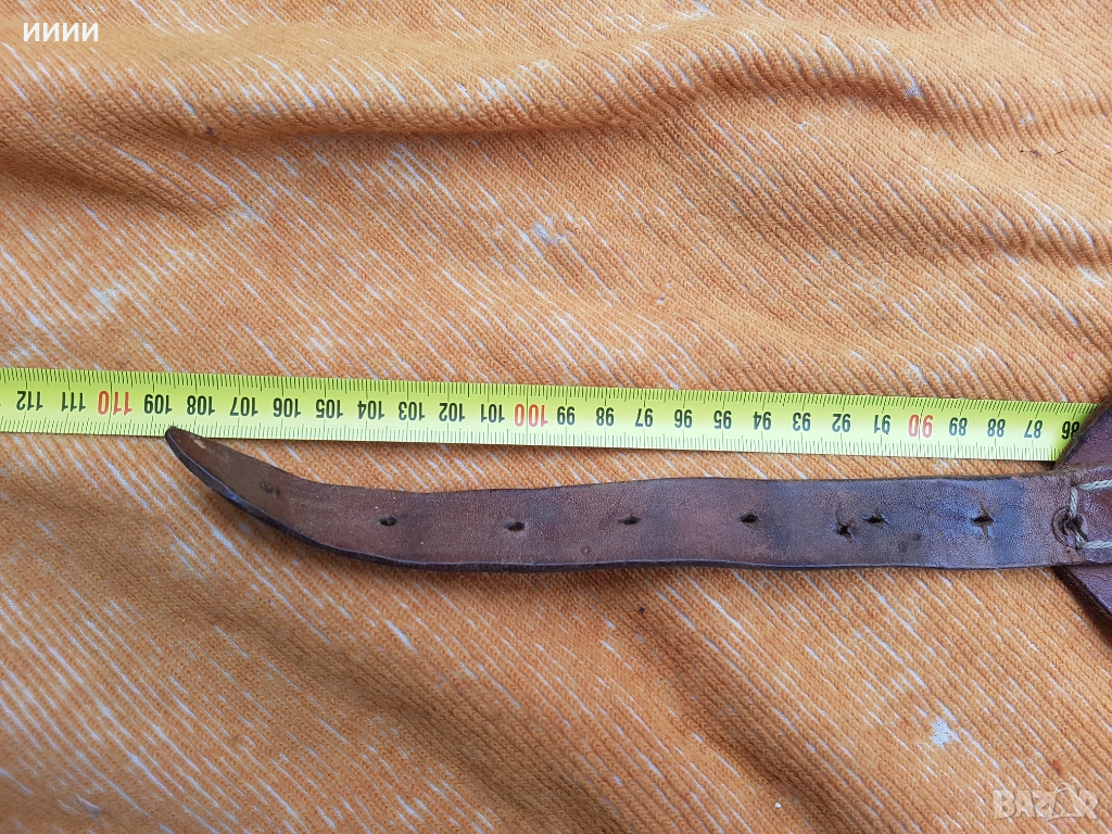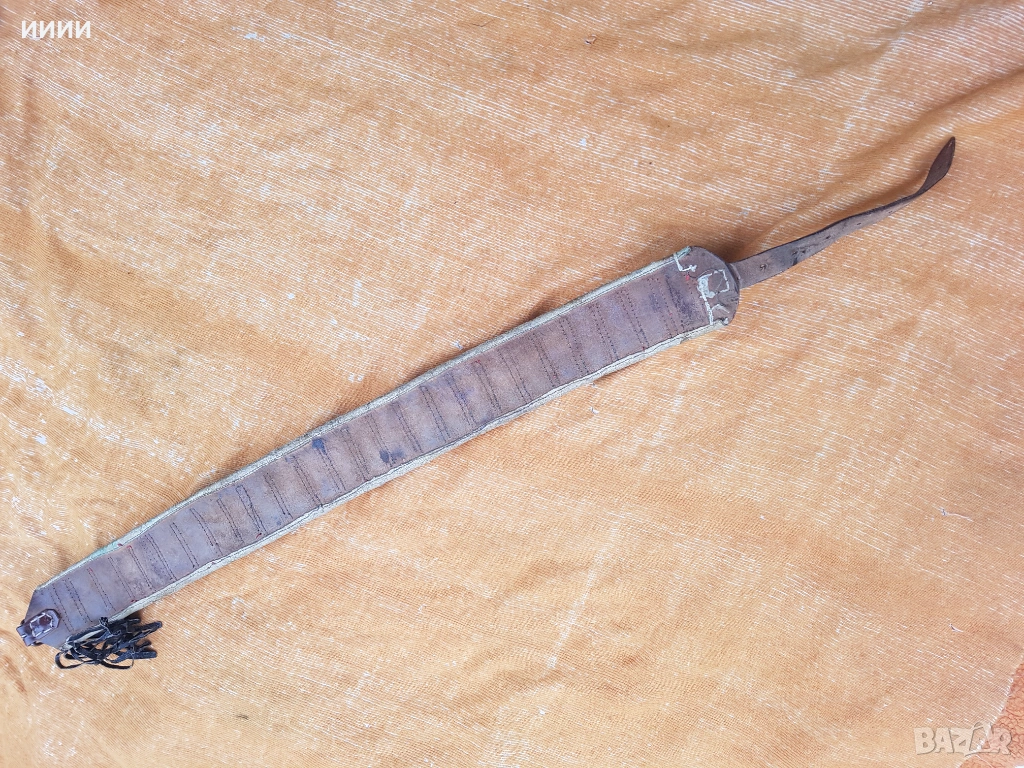 Ръчно изработен, от естествена кожа. Запазен, здрав и годен за дълга употреба. Обща дължина 108 см.