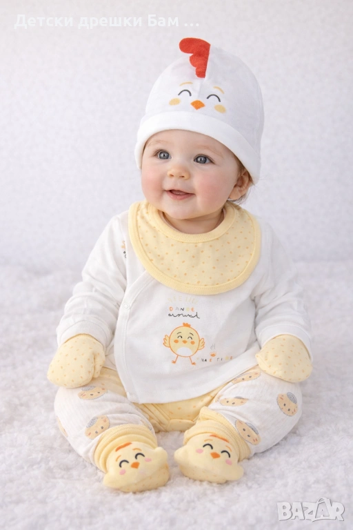 Очарователен бебешки комплект Пиленце, изработен от мека и приятна на допир материя, създаден специално за комфорта на най-малките.