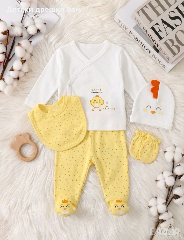 Веселият дизайн с пиленце придава сладка и нежна визия, а практичните кройки осигуряват удобство и свобода на движение.