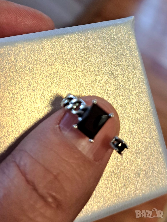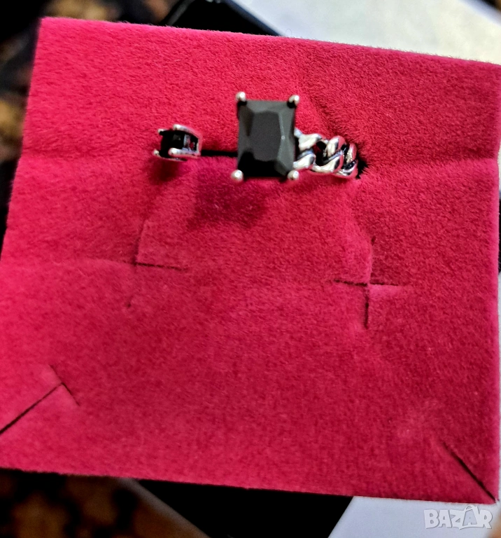 Нов сребърен пръстен с кутийка ,сертификат и подаръчна торбичка.Стои прекрасно.Отворен ,което го прави универсален размер.С два черни циркониеви камъка,малък и голям.