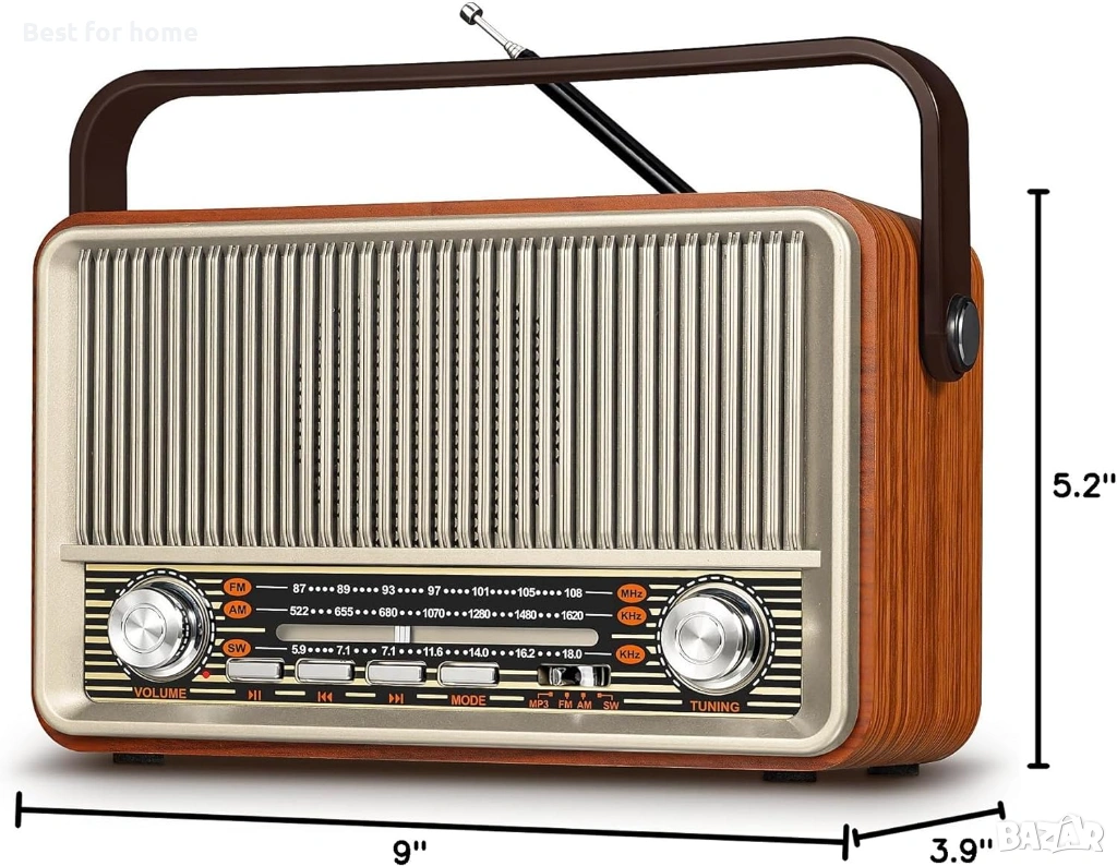 【𝐑𝐚𝐝𝐢𝐨 𝐰𝐢𝐭𝐡 𝐁𝐞𝐬𝐭 𝐑𝐞𝐜𝐞𝐩𝐭𝐢𝐨𝐧】3-бандово радио (FM: 87-108MHz, AM: 522-1620KHz, SW: 5.9-18.0MHz. Винтидж am fm радиото с най-добър прием, оборудвано с висококачествен DSP чип, произведен в САЩ, е по-чувствително към улавяния сигнал. Със супер дълга (16.6 инча) и 360-градусова въртяща се антена, която прави приема му по-стабилен, am fm sw радиото е в състояние да хване и най-слабите станции. Лесно ще намерите любимите си станции и ще се насладите на футболни мачове, прогноза за времето или класическа музика с ретро радиото.
