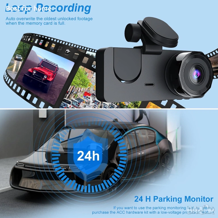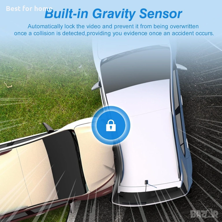 G-сензор за аварийно заключване и монитор за паркиране: С вграден G-сензор, видеорегистраторът автоматично заключва и запазва записа по време на внезапни удари или сблъсъци, предотвратявайки презаписването му. 24-часовият монитор за паркиране записва всяка подозрителна активност, докато колата ви е паркирана, като я защитава дори когато сте далеч (необходим е комплект за окабеляване за непрекъснато наблюдение).