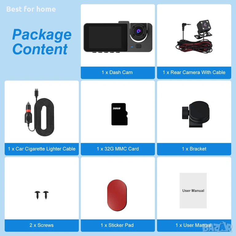 3-канална видеорегистратор за автомобили отпред и отзад, 1080P FHD камера за кола с 32G MMC карта, нощно виждане, G-сензор, детектор на движение, паркинг монитор, цикличен запис за автомобили, SUV-ове, камиони.