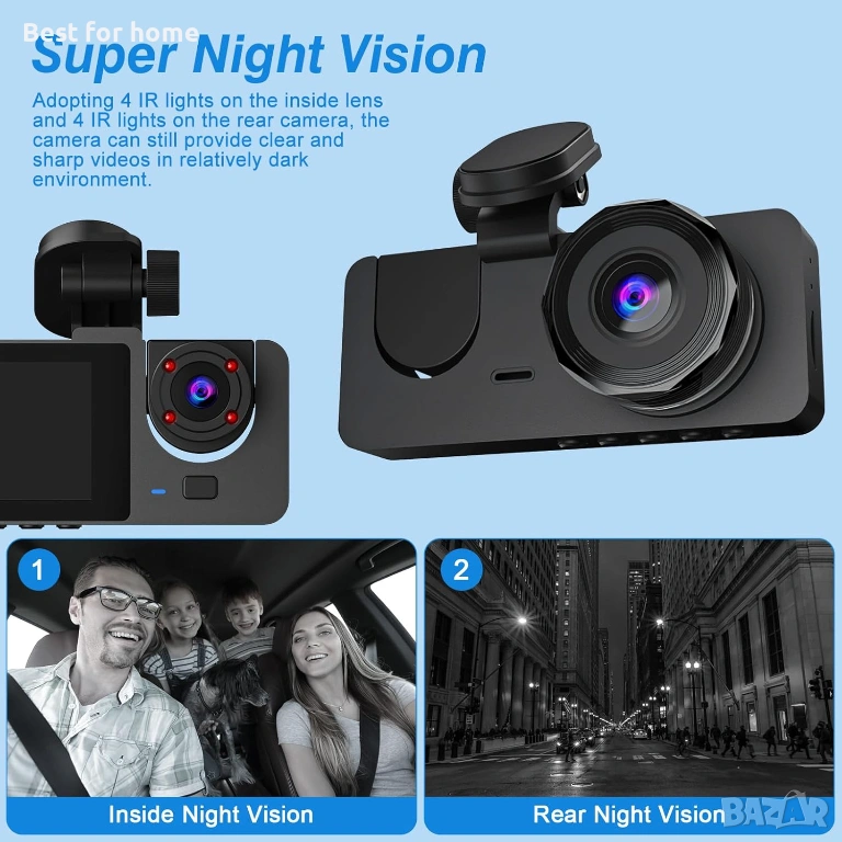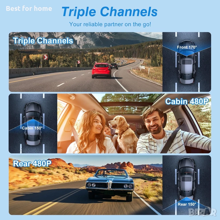 3-канален 1080P Full HD запис: Тази камера за автомобил едновременно записва предната, вътрешната и задната част с 1080P Full HD резолюция, осигурявайки цялостна защита за вашия автомобил. 170° широкоъгълният обектив покрива множество ленти, заснемайки важни детайли като регистрационни номера и пътни знаци, гарантирайки, че имате ясни доказателства в случай на инцидент.