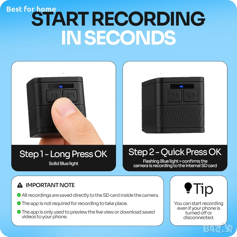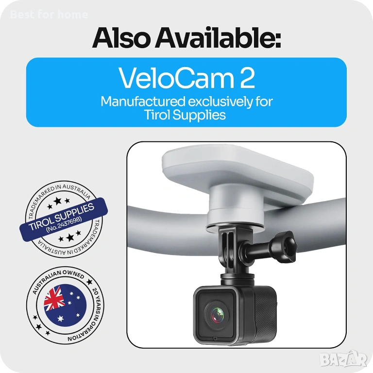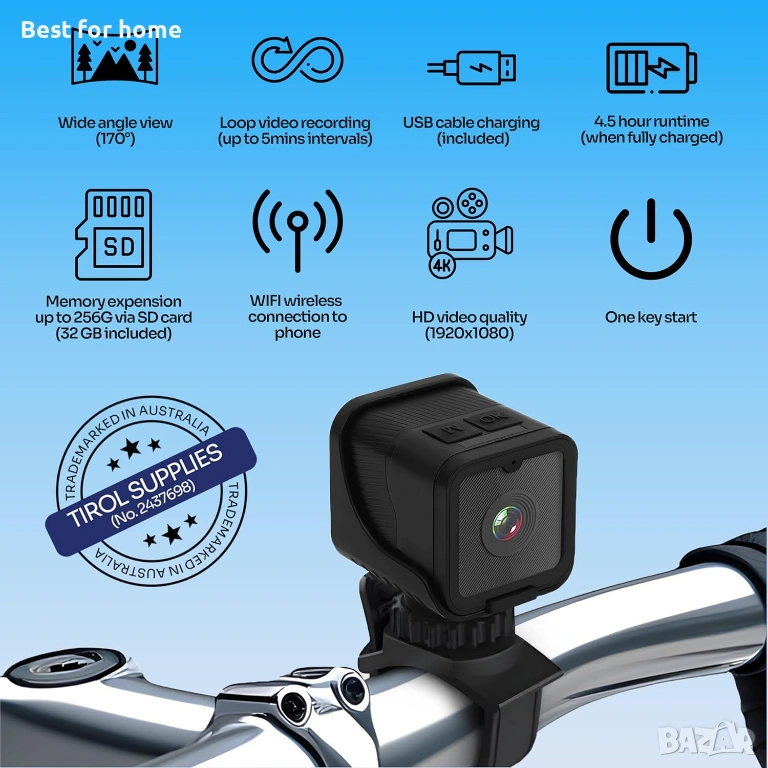 АВСТРАЛИЙСКА ПРИТЕЖАВАНА И ДОВЕРЕНА КОЛОЕЗДАЧНА КАМЕРА: TIROL SUPPLIES е австралийска марка, на която се доверяват повече от 20 години. Тази лека велосипедна камера служи и като компактна екшън камера, идеална за пътуващи до работа и велосипедисти. Елегантната ѝ конструкция поддържа аеродинамичната ви конструкция, което я прави идеална мини екшън камера за ежедневна употреба.