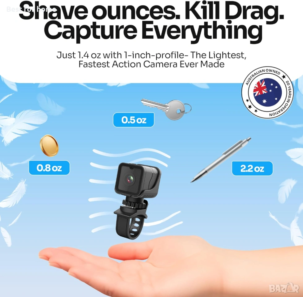 УЛТРА-ЛЕКА, АЕРОДИНАМИЧНА ВЕЛОСИПЕДНА КАМЕРА: С тегло само 41 грама, тази аеродинамична велокамера се монтира удобно на каски, кормило или колчета на седалките. Бързо освобождаващата се скоба против кражба добавя сигурност, което я прави надеждна алтернатива на спортната камера и многофункционална мини екшън камера за ежедневно колоездене и приключенски пътувания.