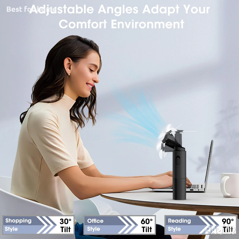 【Повече перки, силен вятър】Това е нашата подобрена версия на преносим ръчен вентилатор, която се различава от другите. Той има 3 силиконови перки, които увеличават с 30% силата на околния хладен въздушен поток, за да ви поддържат в комфортна среда. Регулируемите ъгли на посоката на вятъра от 30° до 90° задоволяват вашите нужди навсякъде. Стабилен и издръжлив, не променя лесно посоката на вятъра.