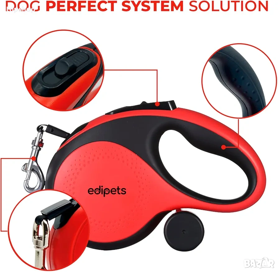 Продавам висококачествена прибираща се автоматична каишка за кучета на испанската марка Edipets. Каишката е в наситен червен цвят и предлага изключителна свобода на движение за вашия любимец.
