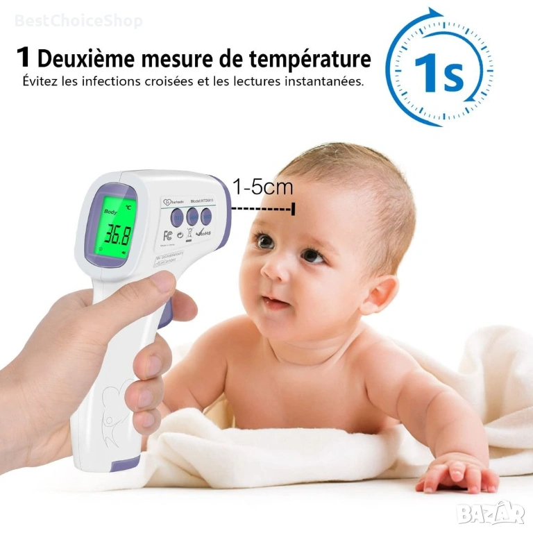 - Използва инфрачервена технология за бързо и точно измерване на телесната температура без контакт с кожата.