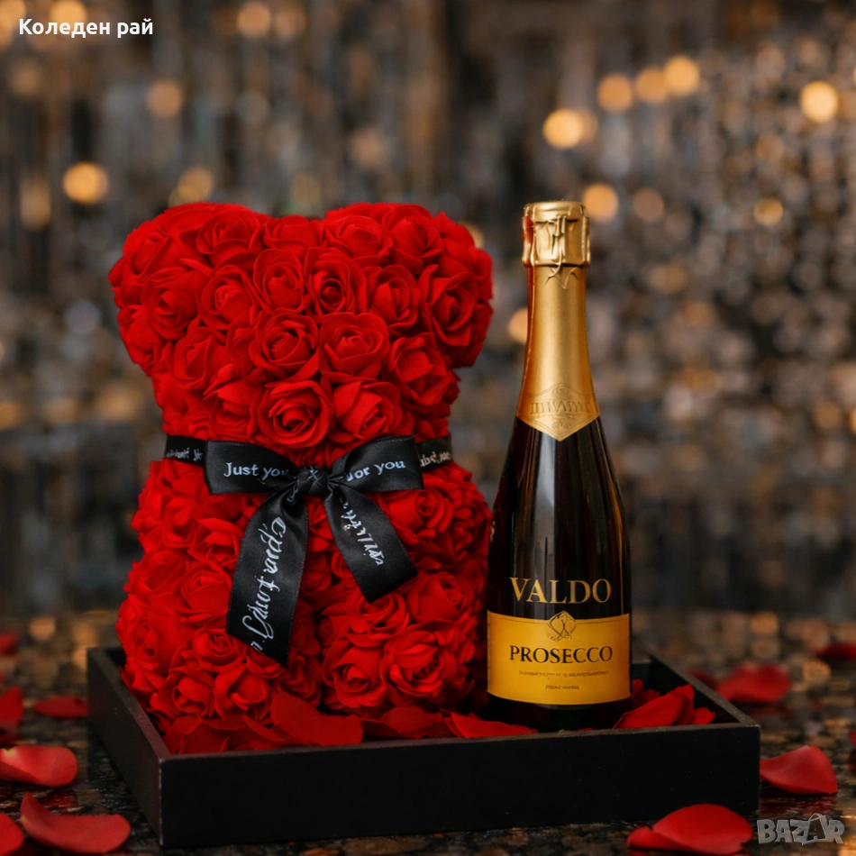 Знаеш, че само едно мече може да е малко, а само бутилка е твърде стандартно. Искаш да изглежда така, сякаш си планирал всеки детайл седмици наред. Ние събрахме класическата романтика и празничния дух на едно място. Този комплект не е просто подарък, той е готова сцена за вашата вечер.