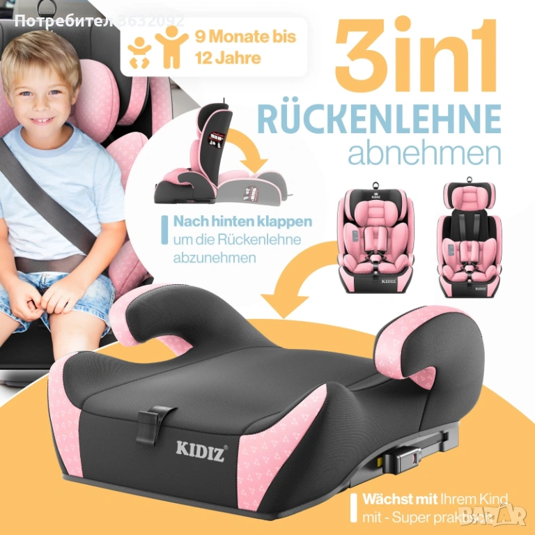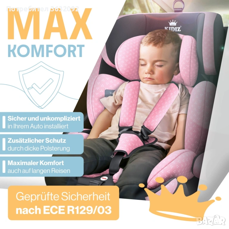 Детско столче за кола KIDIZ със сертифицирана безопасност по ECE R129/03, 5-точкова система за колан, ISOFIX адаптер, лек дизайн (само 3,8 кг) и ергономична облегалка за глава – за безопасни и комфортни пътувания за вашето дете.