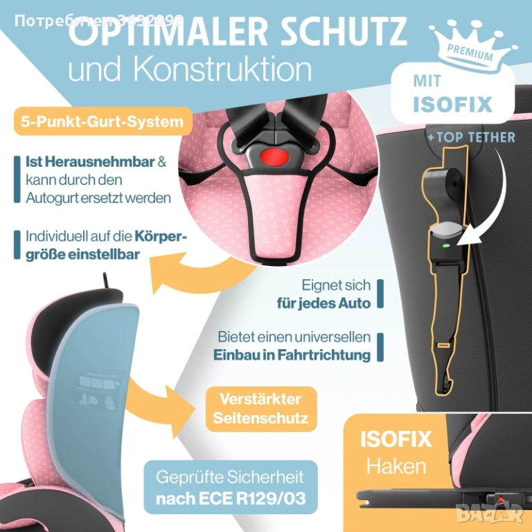 Детско столче за кола, 9кг-36кг, Isofix система, ECE R129/03,(Група 1+2+3)