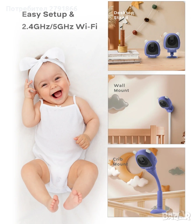 Лесна настройка и двубандов WiFi: монтаж - гъвкаво монтиране, монтаж за детско креватче. Съвместим с честотните ленти 2.4 GHz и 5 GHz за стабилна връзка. Бърза настройка за минути.