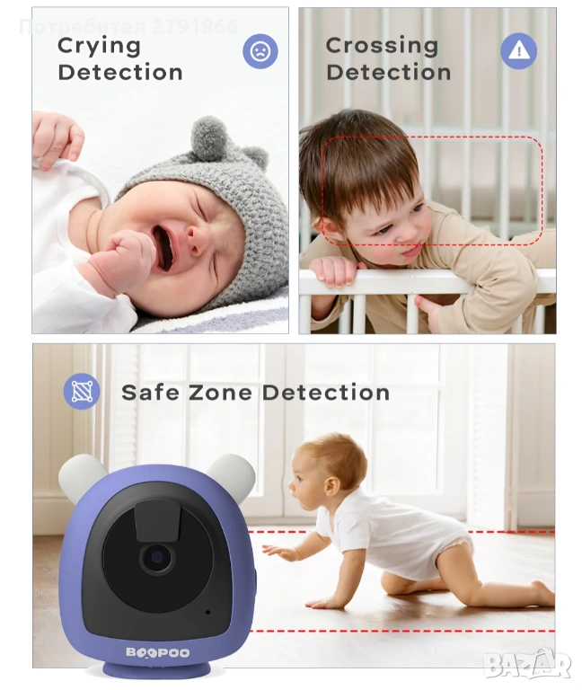 Разпознаване на плач/пресичане/безопасна зона и двупосочно аудио: Точно разпознава плача, проследява движенията и задава безопасни зони за известия. Двупосочното аудио ви позволява да чувате и успокоявате бебето си незабавно.