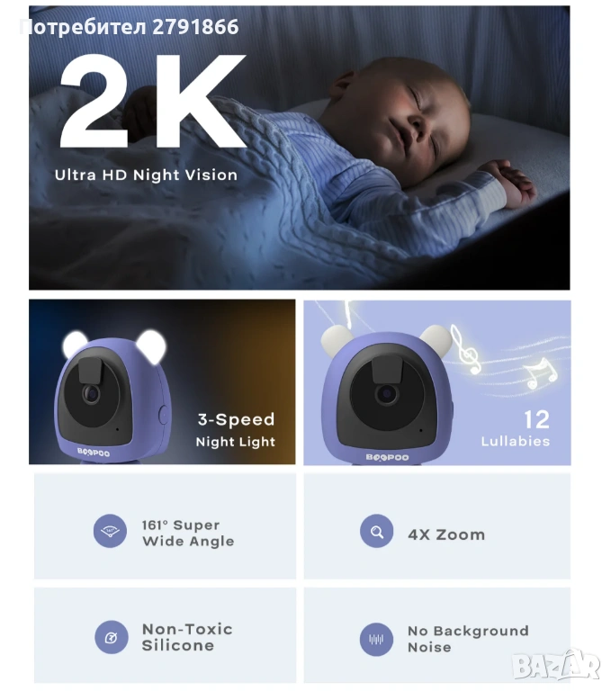 Smart бебефон BOOPOO BC2 наблюдение на дишането и съня приложение без абонамент, нов - запечатан