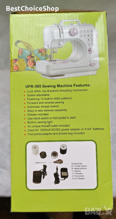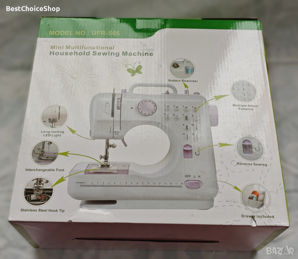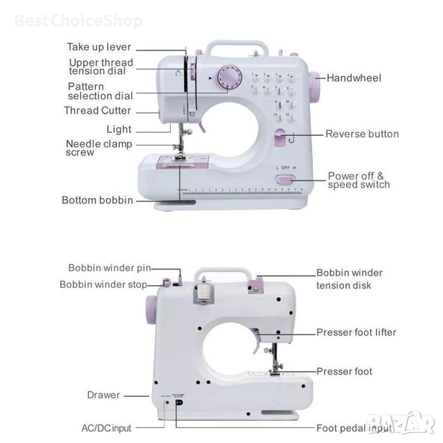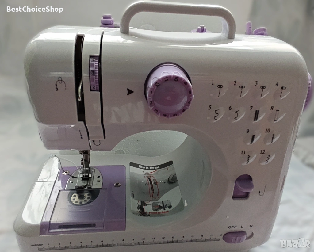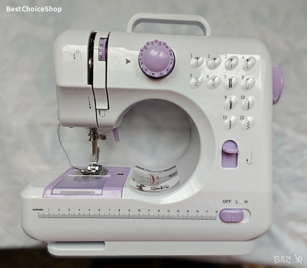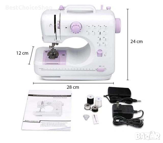 - Тип: Преносима, компактна, многофункционална шевна машина.
