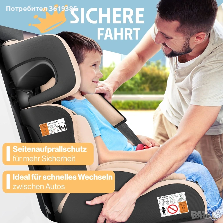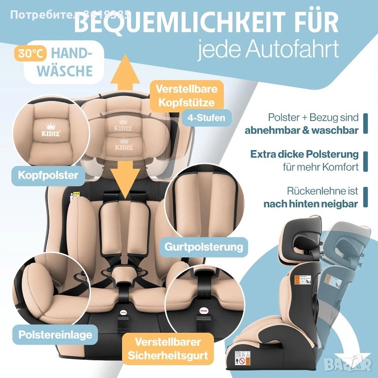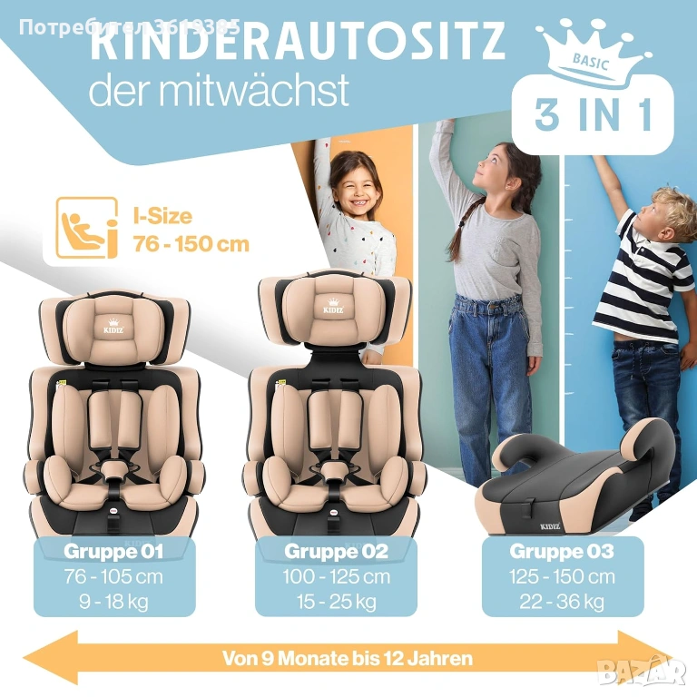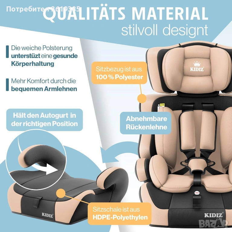 Висококачествено столче за кола Kidiz за деца на възраст 1-12 години.