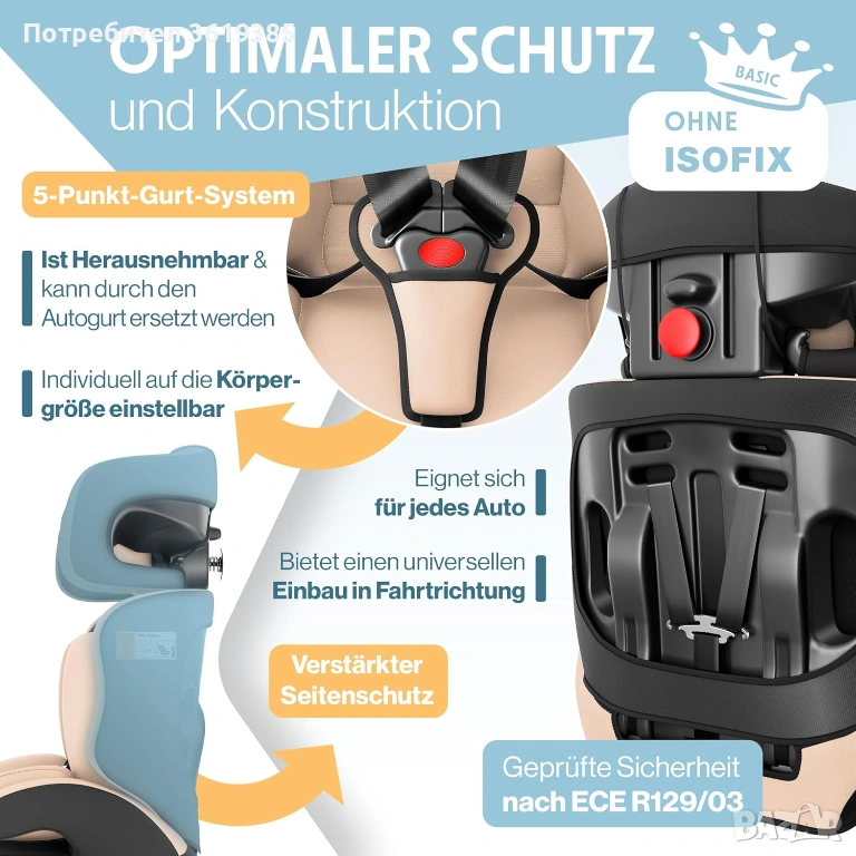 Столчето за кола е тествано и одобрено съгласно ECE R129/03, (Група 1+2+3, телесно тегло 9-36 кг – приблизително 1-12 години).