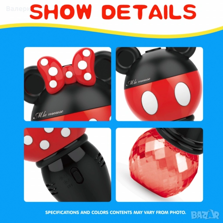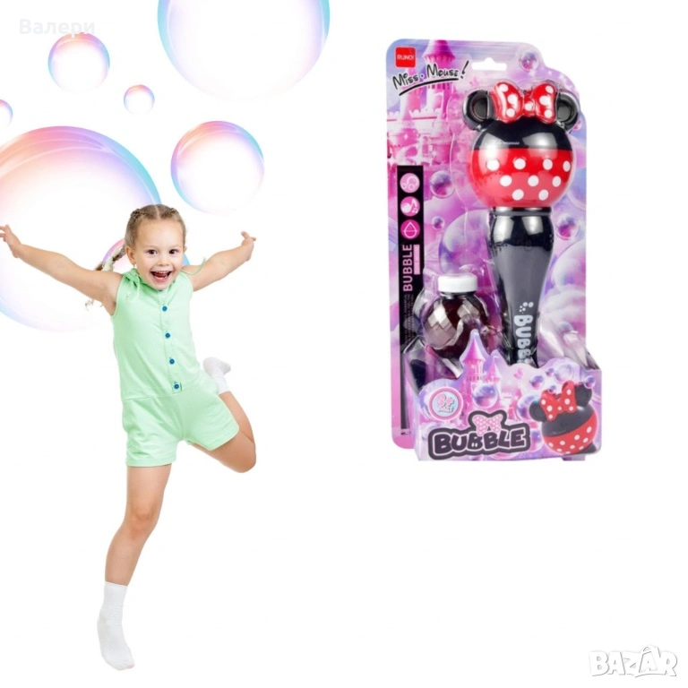 Детска играчка за сапунени балончета със забавен дизайн, вдъхновен от популярния анимационен герой Мини Маус. Създава множество сапунени балончета с едно натискане на бутон, придружени от светлинни ефекти и забавен звук. Идеална за игри на открито и закрито.