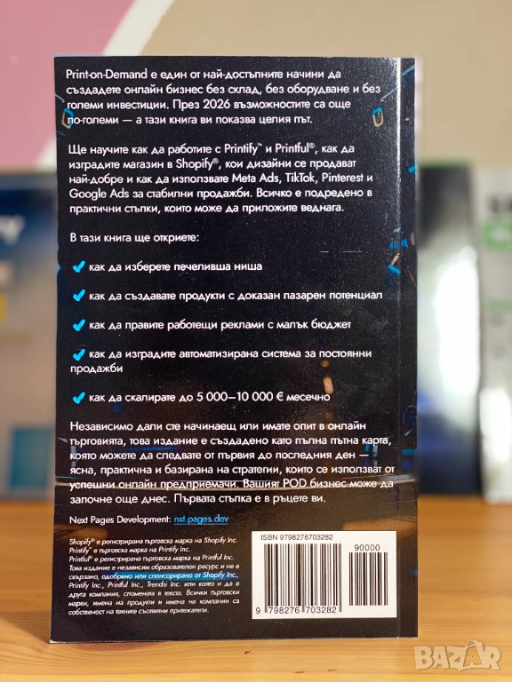 В тази книга ще откриете цялата система зад успешния Print-on-Demand модел през 2026 — от избора на ниша и създаването на дизайни, до настройването на Shopify магазин, маркетинга, рекламите, автоматизацията и скалирането до стабилен месечен доход. Авторът показва как да използвате платформи като Printify™, Printful®, Shopify®, Meta Ads, TikTok Ads, Pinterest и Google Ads, за да изградите бранд, който се развива дори докато спите.
