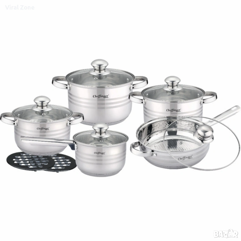 Комплект съдове за готвене 12 части Cheffinger, с индукционно дъно и стъклени капаци