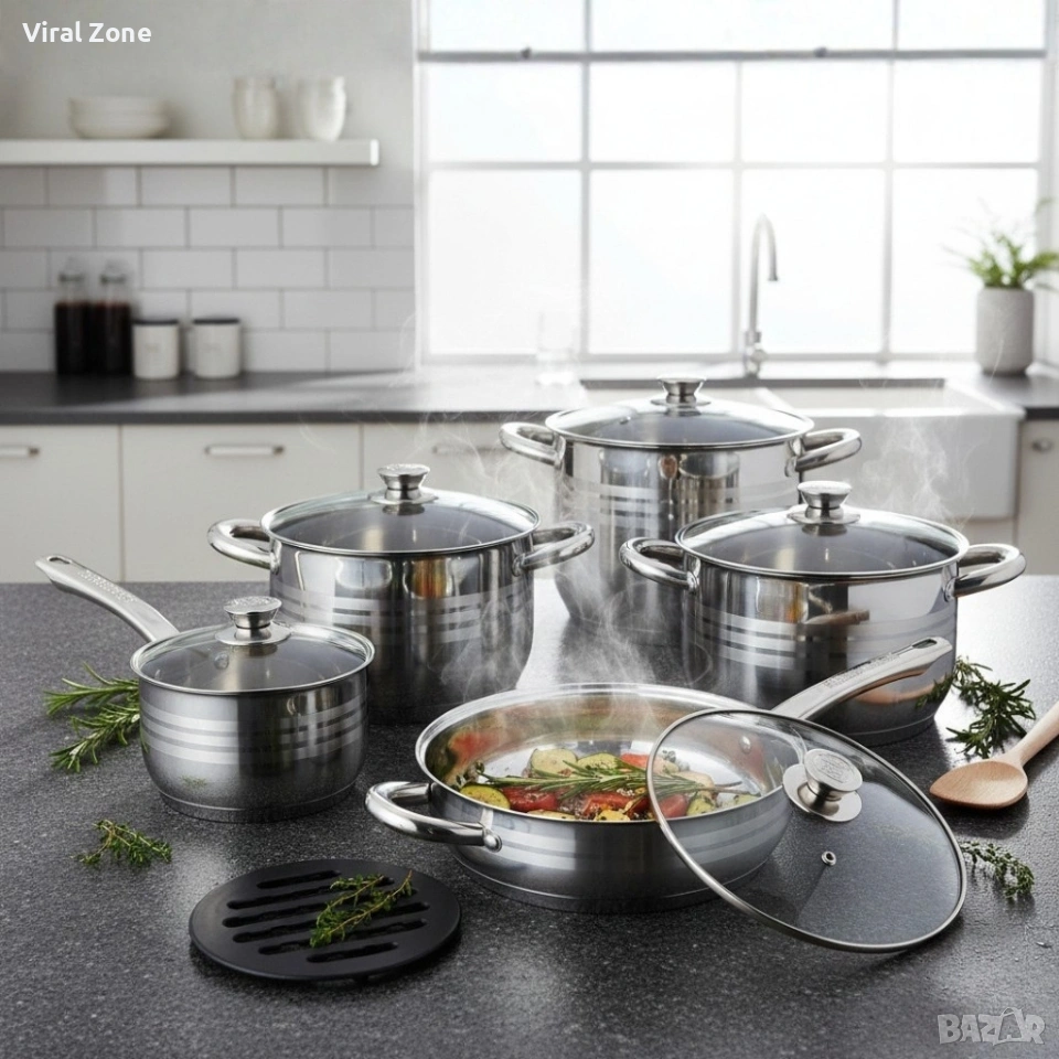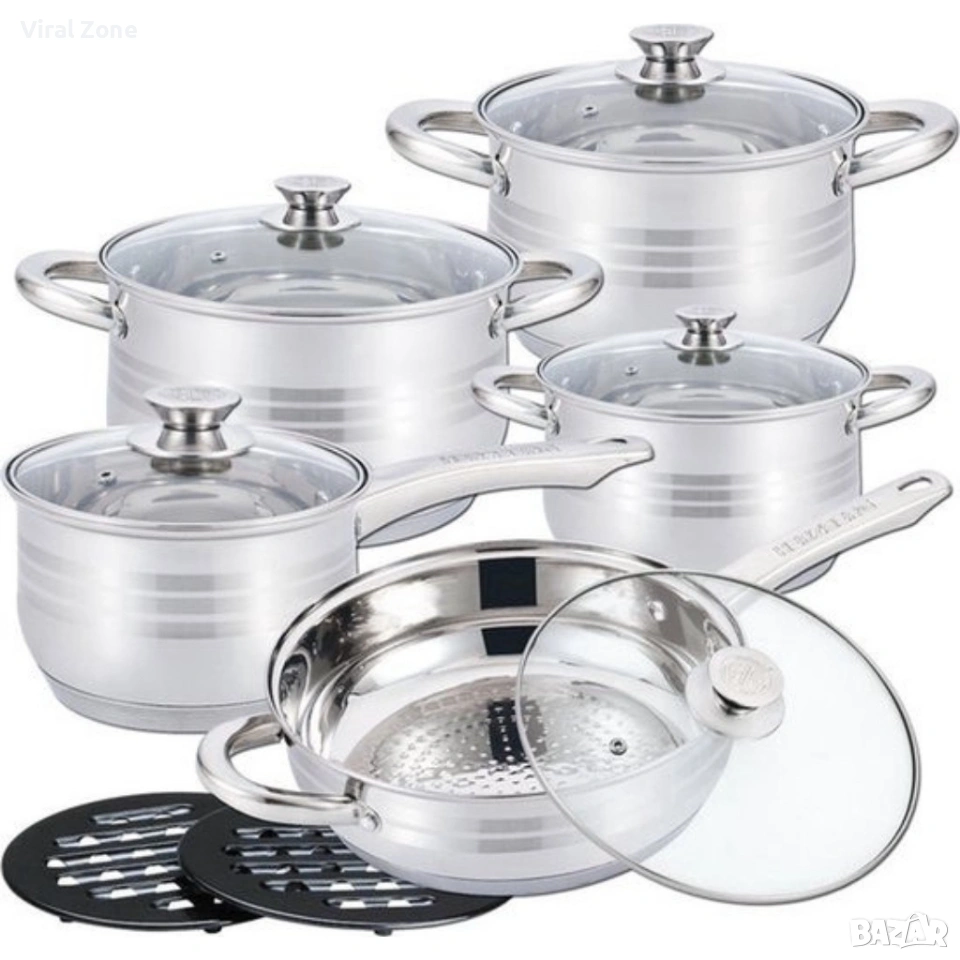 Комплект съдове за готвене 12 части Cheffinger, с индукционно дъно и стъклени капаци – тенджери, касерола и тиган