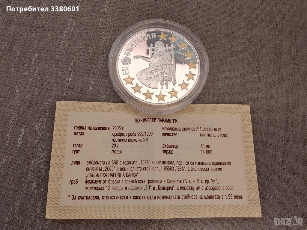Сребърна Монета 1.95583 България Европейски Съюз 2005 г. → Обява 53207755