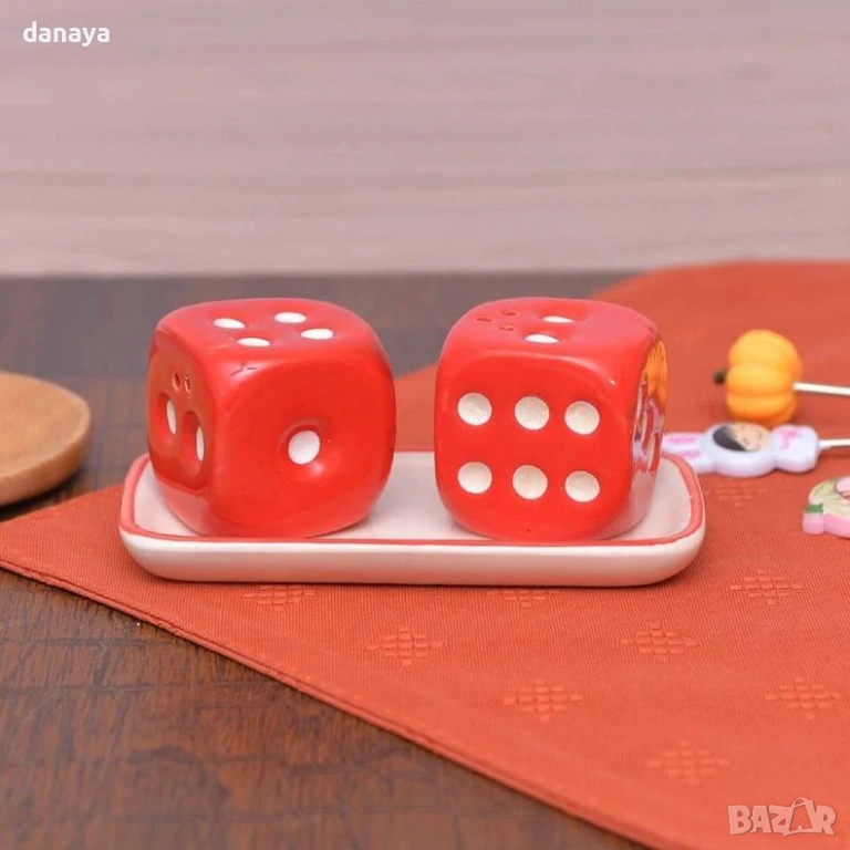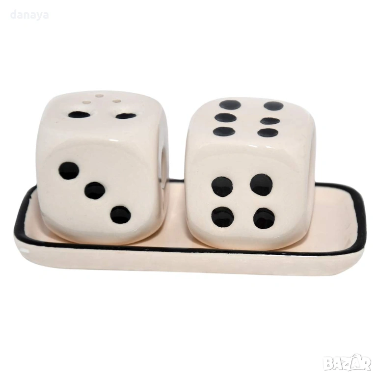 Солница и пиперница във формата на зарчета – оригинален комплект солнички, който веднага привлича вниманието на масата.