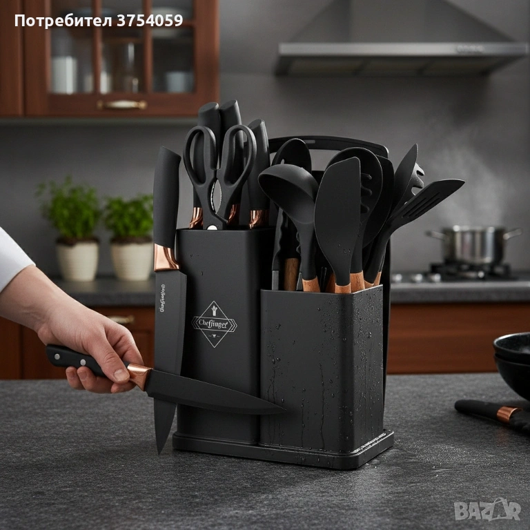 Кухненски комплект от 19 части Cheffinger KSUT01 - ножове, силиконови прибори, поставка и дъска