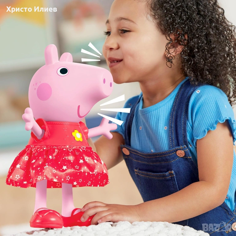Тук започва партито с Peppa Pig. Пепа кани малките фенове да се присъединят към забавлението! Тази интерактивна, говореща, пееща и танцуваща играчка за възраст над 3 години може да разпали въображението на малките и да ги накара да се движат и танцуват с най-добрия си приятел Пепа! Децата могат да слагат и изключват емблематичните жълти обувки на Peppa, за да я поставят в режим кална локва или парти режим, за да превключват между звуци, фрази, мелодия и игра. Тя също реагира на звуци с фрази и звукови ефекти. Всяко дете, което обича фигурки на Peppa Pig или комплекти за игра Peppa Pig, ще хареса тази интерактивна електронна играчка за момичета и момчета.
