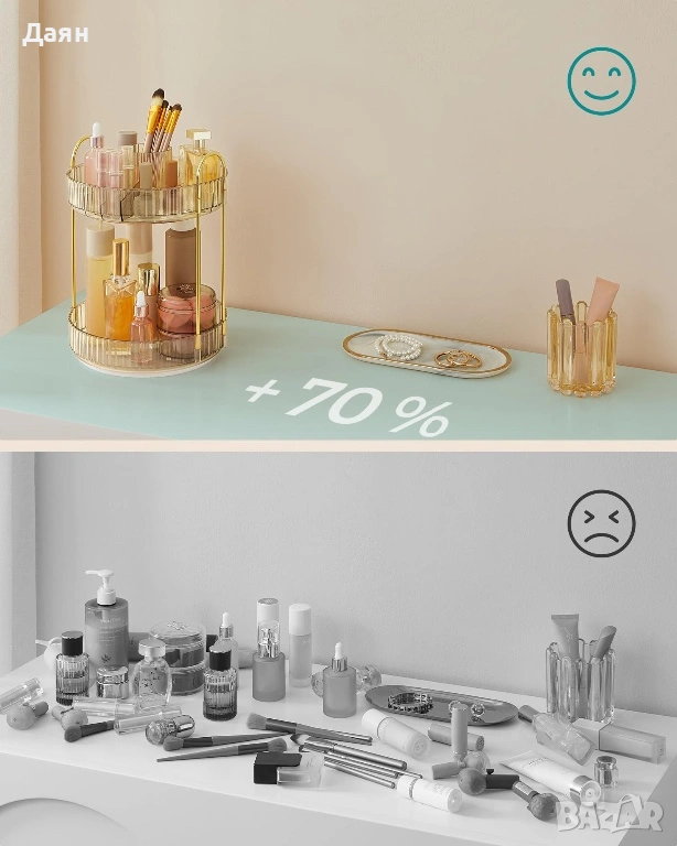 [ЗАВЪРТАНЕ НА 360°] Въртящият се на 360° дизайн на този органайзер за козметика улеснява достъпа и организирането на козметиката, а повдигнатите ръбове предотвратяват падането на козметиката при завъртане или хващане.