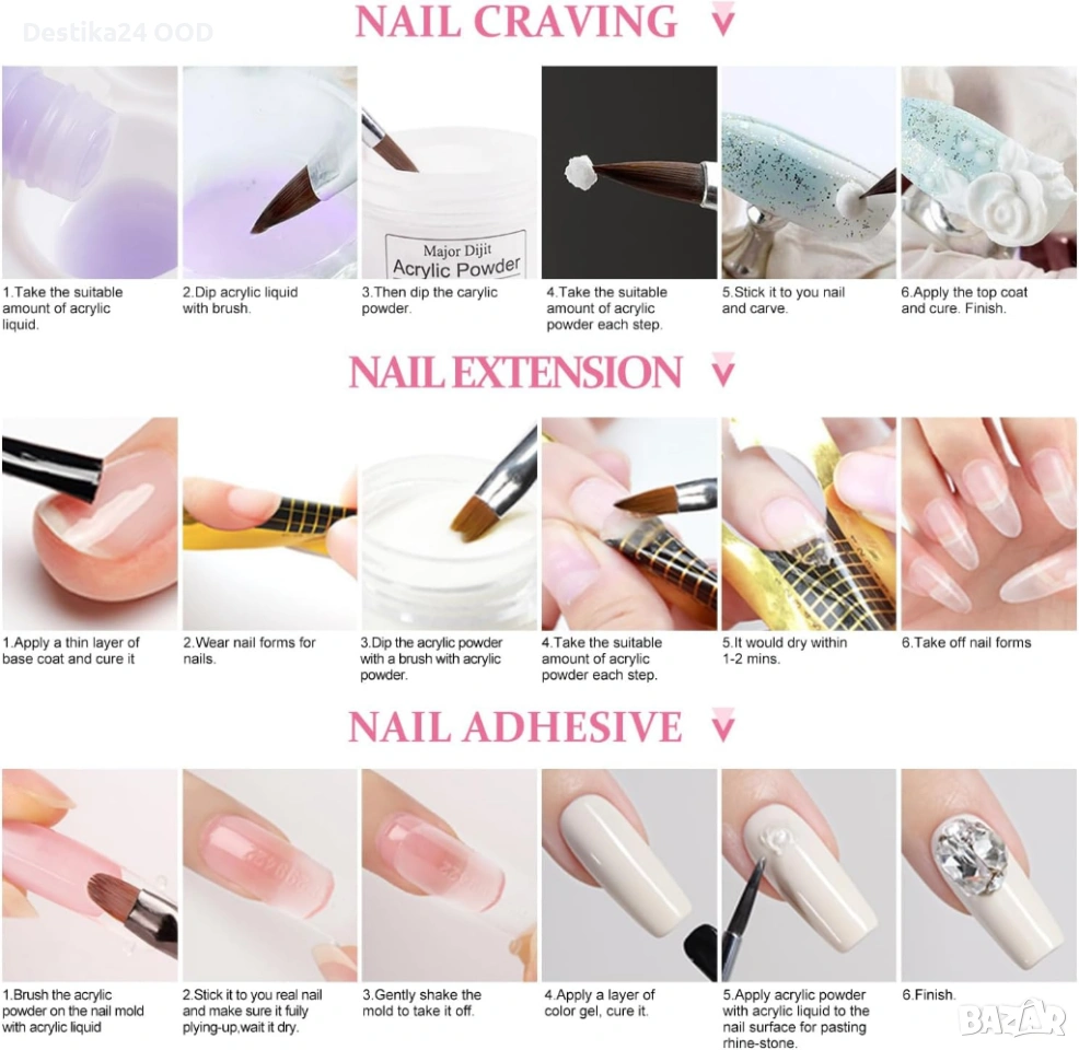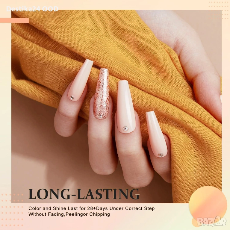 Акрилната система не изисква UV/LED лампа за втвърдяване, което я прави удобна и щадяща кожата. При правилна употреба изсъхва за около 2–3 минути и осигурява дълготраен и устойчив резултат до 2–3 седмици.