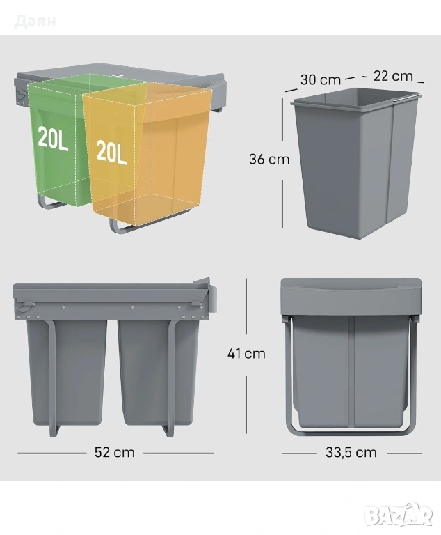 - Капацитет 40 л: този кош за долен шкаф има две отделения от 20 литра, които позволяват лесно разделяне на рециклирания материал и отпадъците. Поддържайте кухнята си организирана и без хаос.