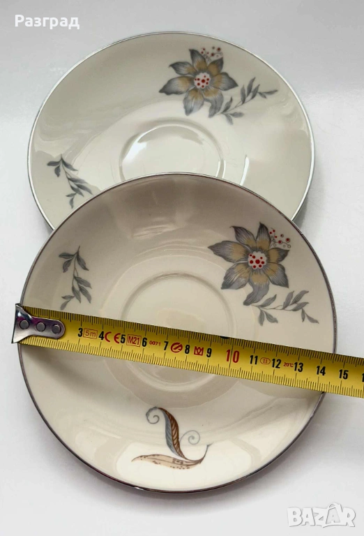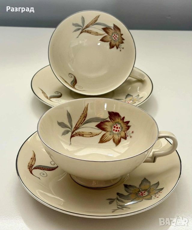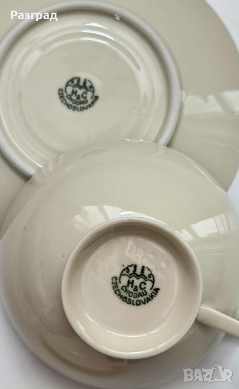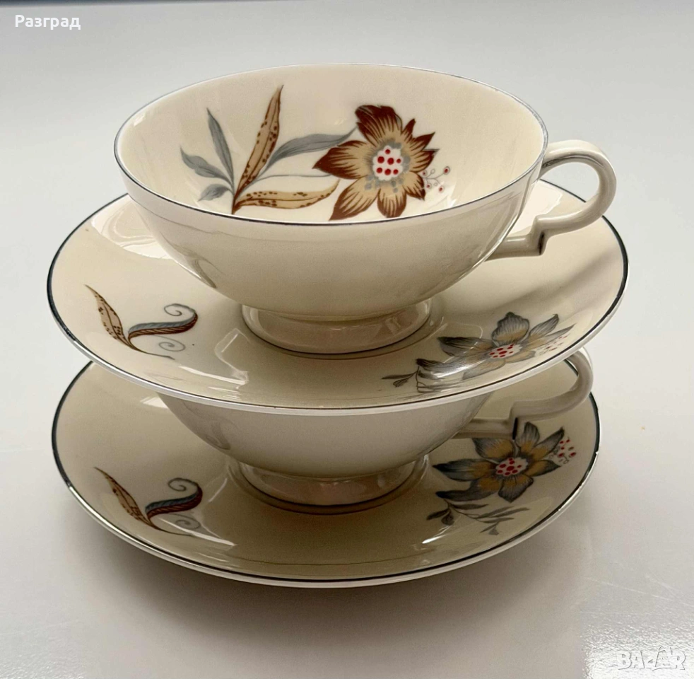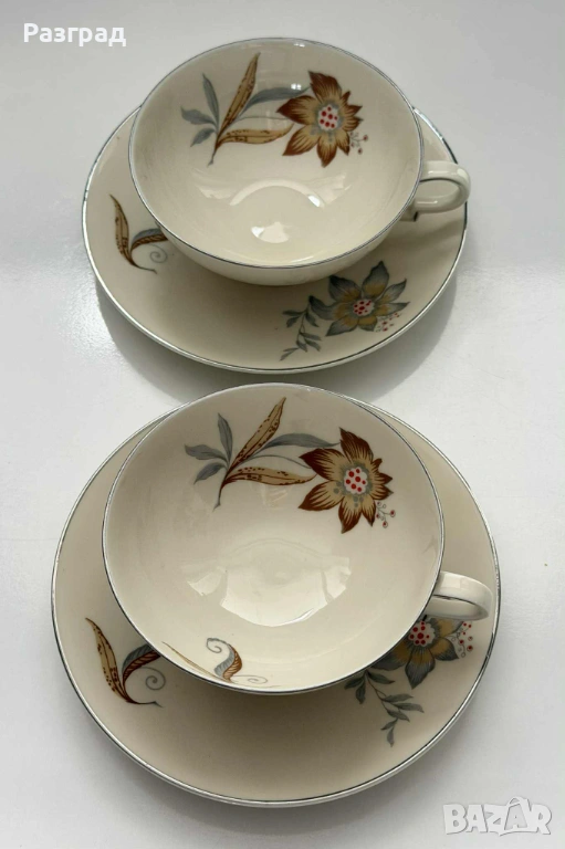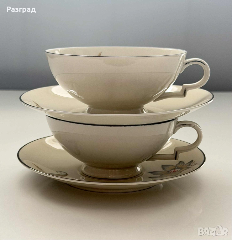 Два сета чаши с чинийки подходящи за чай или кафе, с вместимост 180-200мл. Произведени в средата на миналия век от H&C Czechoslovakia. Фин, костен порцелан в кремав цвят, завършен със сребрист кант. Дръжките са в стил art deco. В прекрасно винтидж състояние, без дефекти.