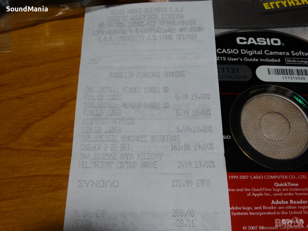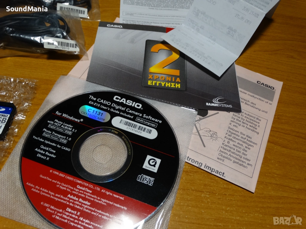 Комплекта е виден на фотосите - апарат, оригинално зарядно с кабел за електрическата мрежа, нова батерия, аналог на оригиналната NP-20, кабели за връзка към компютър, както и ТВ ( неразпечатан ), пълен набор инструкции и документи, та дори за употреба на калъфчето :-) , самото калъфче, което е без забележки и протрито, качествена SD памет с капацитет 4 GB и дори оригиналната касова бележка за покупката му от Media Markt за 163.01 евро на 31.03.2008 година !